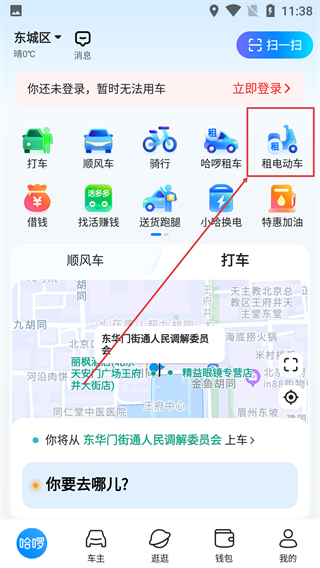 1、在【哈啰】主界面,找到并點擊【租電動車】功能圖標,進入對應的租車服務頁面,可選擇合適的租車方式。
