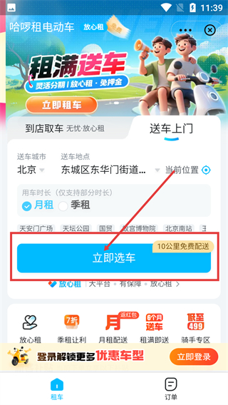 2、進入【租電動車】頁面后,確認送車城市與地點,選擇用車時長,點擊【立即選車】按鈕查看可用車型。