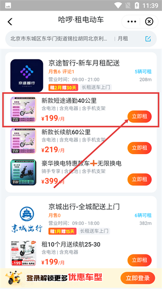 3、在車型列表中,選擇【新款短途通勤40公里】車型,查看其配置與價格,點擊右側【立即租】按鈕進行租賃。
