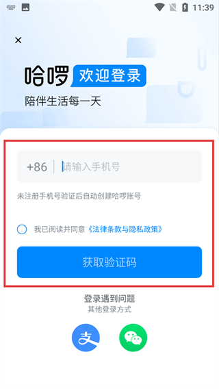 4、跳轉【哈啰】登錄頁面,輸入手機號,點擊【獲取驗證碼】完成登錄驗證即可使用。