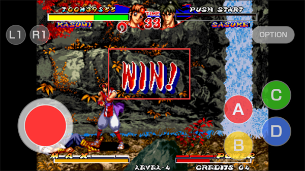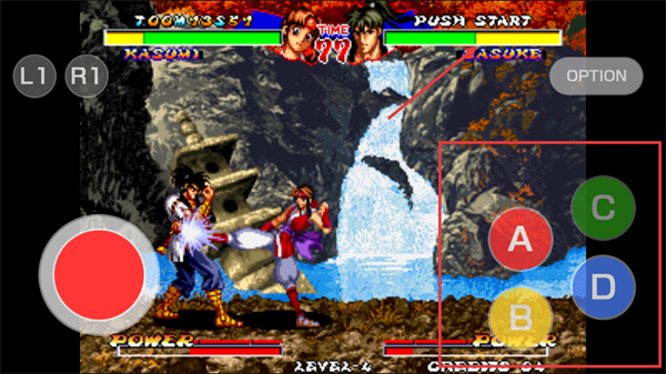 3、采用虛擬搖桿實現八方向移動,并設有輕重不同的斬擊與踢擊按鍵,每種攻擊都有獨特的性能與用途。