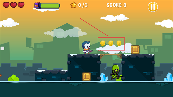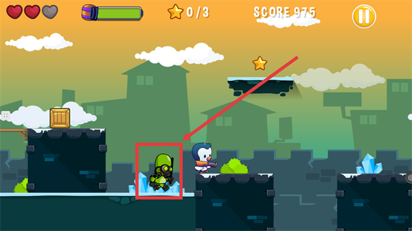 3、遇到綠色怪物敵人時,操控企鵝用武器射擊,清除障礙以便繼續闖關。