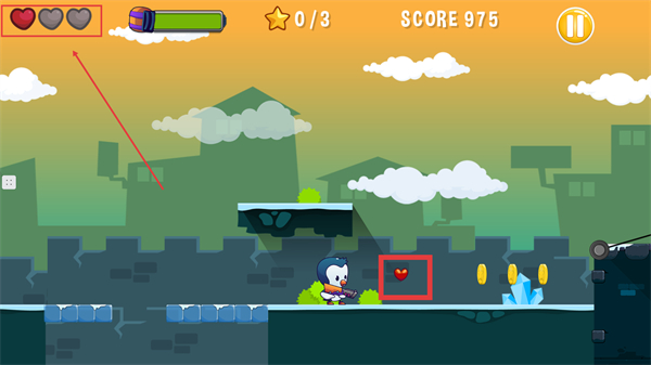 4、看到道路上的紅心道具時,操控企鵝靠近收集,恢復生命值保證闖關安全。