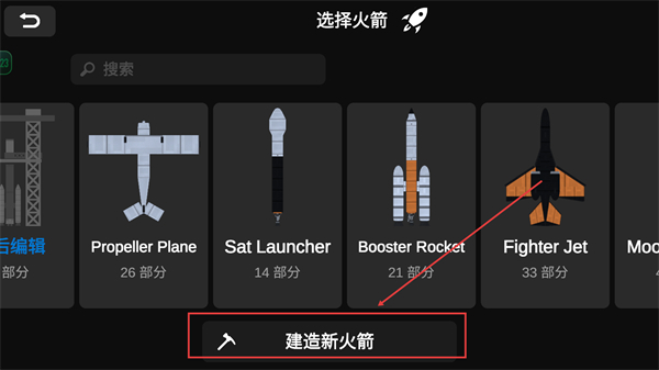 1、進入選擇火箭界面,點擊【建造新火箭】按鈕,即可開始設計專屬火箭的組裝方案,為后續發射做準備。