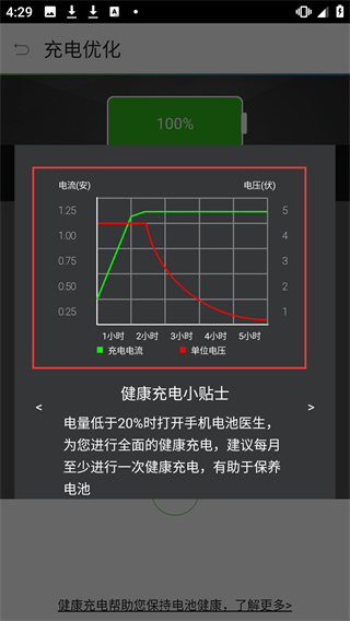 4、進入快速充電的數據頁面后,可查看充電電流與單位電壓的變化圖表及健康充電小貼士。