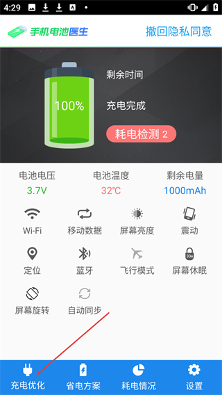 2、在手機電池醫生首頁,點擊底部的【充電優化】選項可進入充電優化頁面。