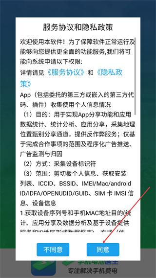 1、在【服務協議和隱私政策】彈窗中,點擊【同意】按鈕可進入手機電池醫生的首頁。
