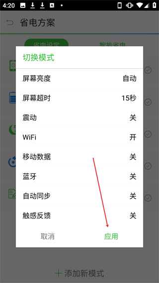 4、在【切換模式】彈窗中,確認(rèn)設(shè)置后點(diǎn)擊【應(yīng)用】按鈕可返回省電方案頁面。