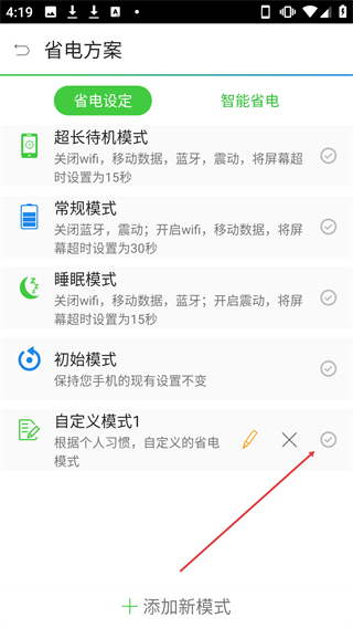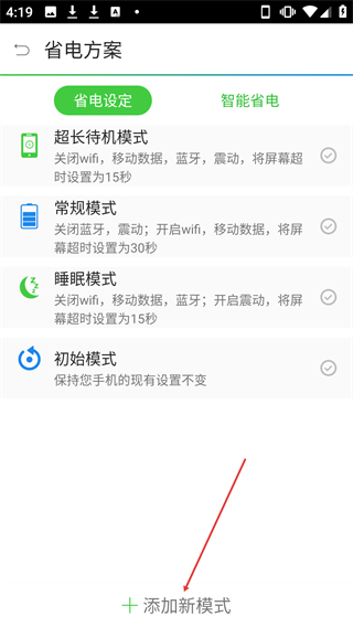 1、在省電方案頁面,點(diǎn)擊【添加新模式】選項(xiàng)可進(jìn)入自定義模式設(shè)置頁面。
