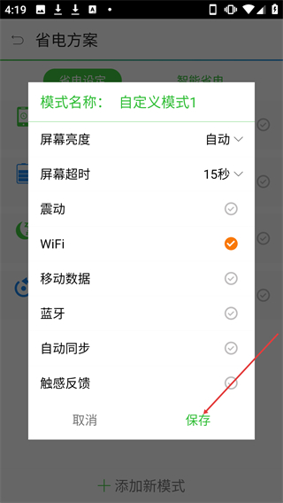 2、在自定義模式設(shè)置頁面,配置參數(shù)后點(diǎn)擊【保存】按鈕可完成自定義省電模式的創(chuàng)建。