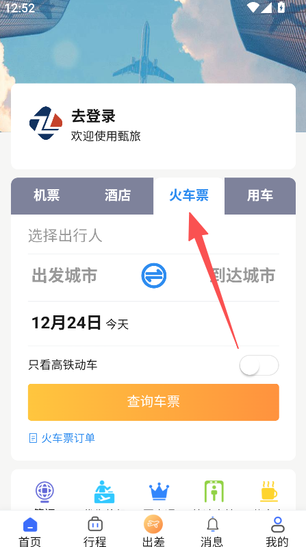 1、打開軟件,進入首頁后點擊火車票選項切換至對應(yīng)服務(wù)頁面。