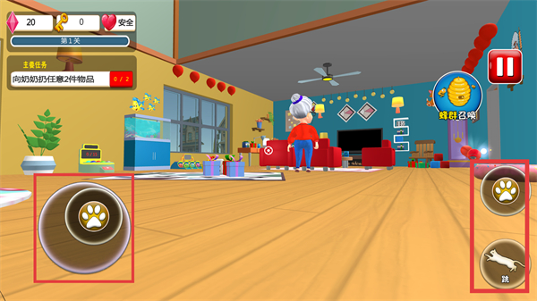 2、在房間內(nèi)尋找可投擲的物品,使用左邊的【移動(dòng)鍵】進(jìn)行移動(dòng),配合右下角的【跳躍】【抓撓】進(jìn)行組合攻擊。