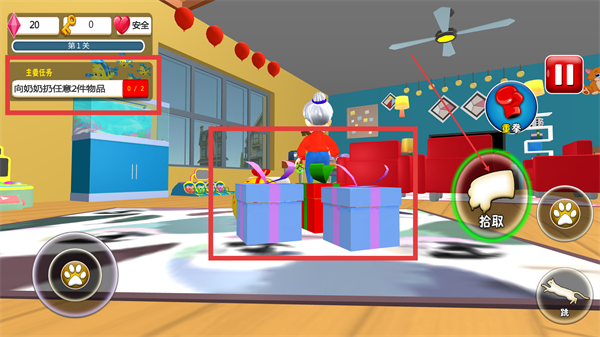 3、靠近禮物盒等物品點(diǎn)擊【拾取】獲取,向奶奶投擲累計(jì)2件,推進(jìn)游戲進(jìn)程解鎖更多內(nèi)容。
