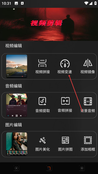 2、在剪輯頁,點擊【視頻變速】選項,進入選擇視頻的素材瀏覽頁面。