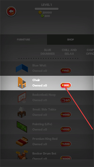 2、進入購物頁面后,選擇【Chair】(椅子),消耗200金幣即可購買該物品,頁面還展示了其他家具及對應的獲取條件。
