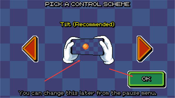 2、在【Pick-A-Control-Scheme】界面,選擇推薦的【Tilt-(Recommended)】控制方案,點(diǎn)擊【OK】按鈕確認(rèn)進(jìn)入游戲。