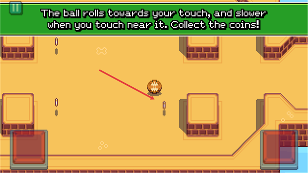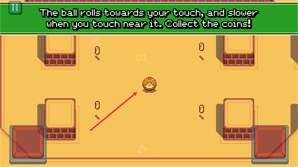 3、掌握規(guī)則,球隨觸摸滾動(dòng),近觸減速,需收集場(chǎng)景中的硬幣。