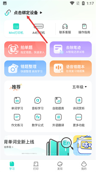 1、進入界面后,點擊【點擊綁定設備】可關聯外設,同時能使用【拍單題】、【錯題整理】等學習功能,還支持【單詞學習】等工具。