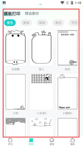 3、切換到打印界面,在【模板打印】、【精選素材】的【便簽】分類下,可選擇不同的模板進行打印。