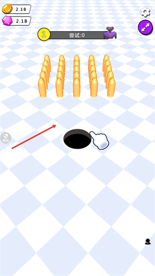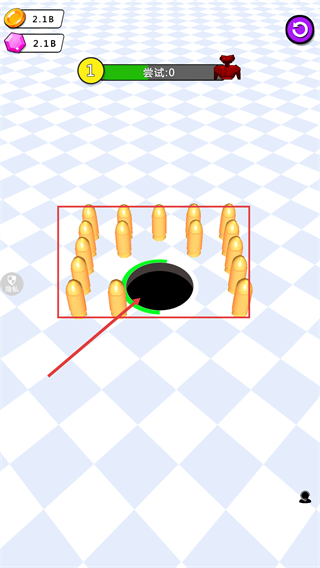 1、點擊界面中的【黑洞】,關聯上方的黃色炮彈堆,當前關卡【嘗試:0】,開啟該階段的核心操作流程。