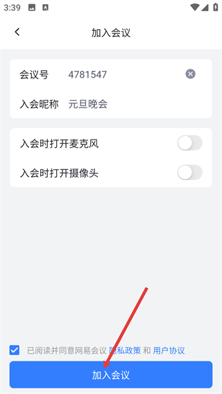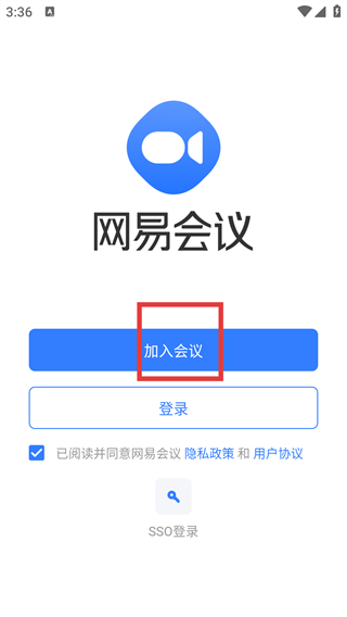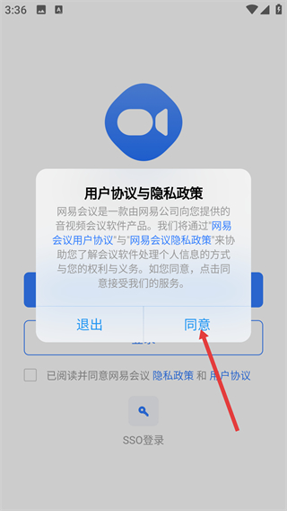 1、在網易會議的用戶協議彈窗中,勾選已閱讀并點擊【同意】按鈕,確認協議后進入應用主界面。