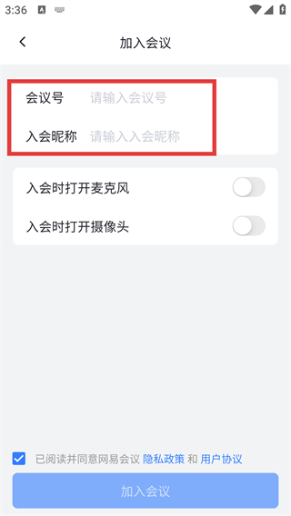 3、在加入會議頁面,找到【會議號】【入會昵稱】輸入框,準備填寫對應信息并設置入會選項。