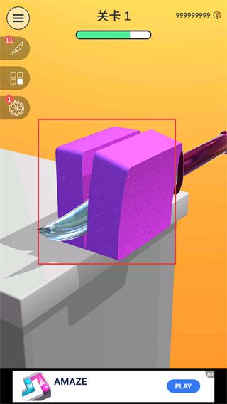 1、進入【關卡1】,根據提示【按住可切割】,長按操作控制刀具對紫色方塊進行切割。