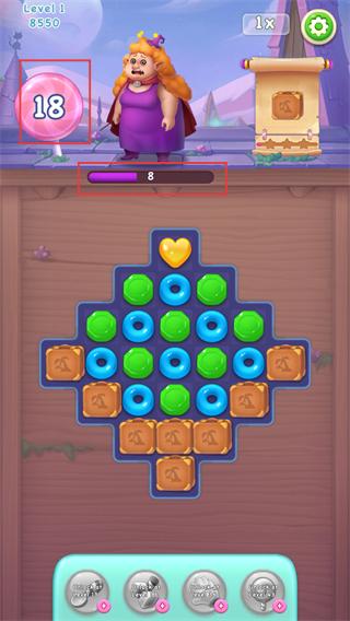 3、持續消除糖果,剩余步數變為18步,目標進度更新為8/18,分數提升至8530,推進關卡進度。