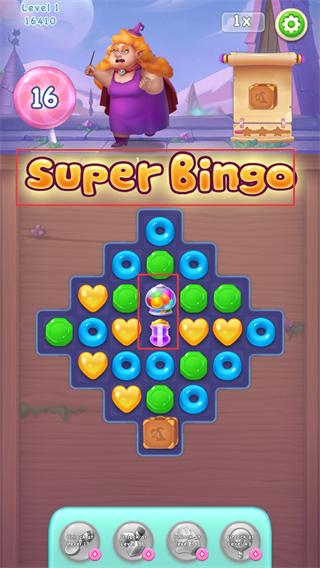 4、觸發【SuperBingo】特效,剩余步數16步,分數達16430,生成特殊糖果(如彩色球),助力快速完成消除目標。