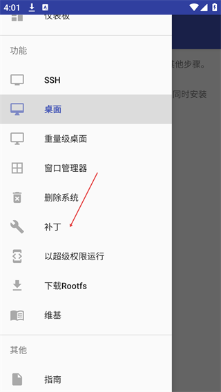 2、在功能列表中,選擇“補丁”選項,進(jìn)入補丁配置頁面。