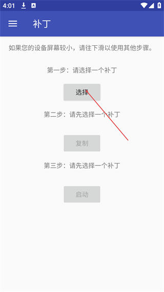 3、在“補丁”頁面,點擊第一步的“選擇”按鈕,彈出補丁選項列表。