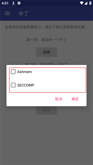 4、在補丁列表中,勾選目標(biāo)補丁(如Ashmem、SECCOMP),點擊“確定”,即可完成補丁選擇,繼續(xù)后續(xù)的復(fù)制、啟動等配置步驟。
