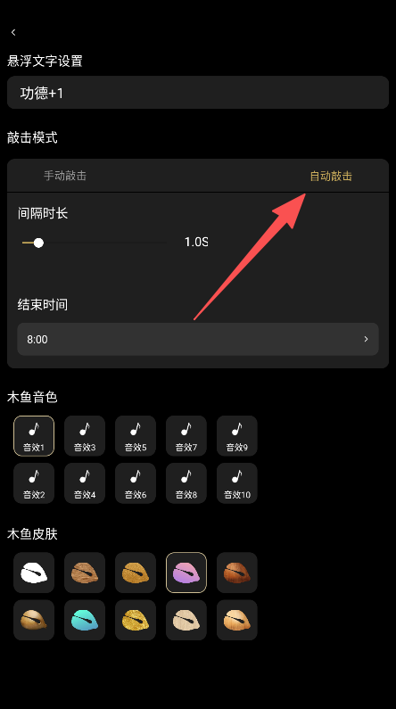 3、在“敲擊模式”中選擇“自動敲擊”可設置間隔時長與結束時間實現(xiàn)自動誦經(jīng)。