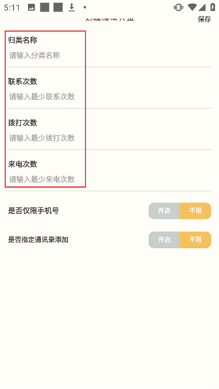 4、在分類編輯頁面,填寫【歸類名稱】【聯(lián)系次數(shù)】等信息后,可完成該通訊分類的設(shè)置。