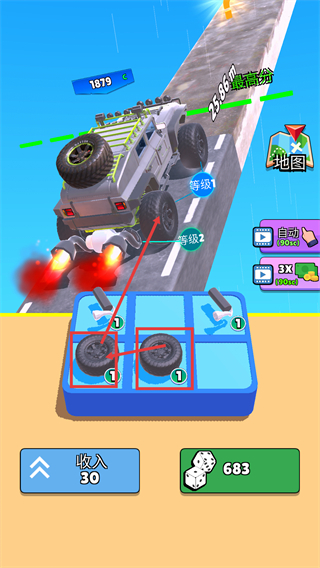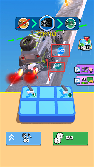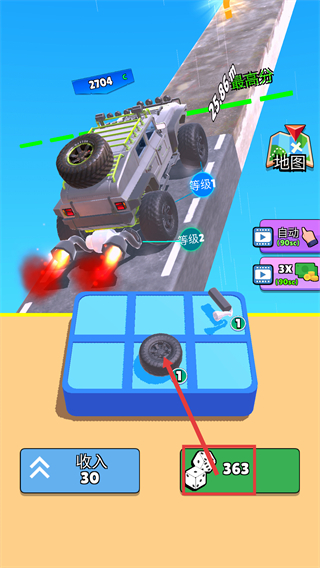 1、消耗【骰子-363】獲取車輛部件(如輪胎),裝配至對應部位提升等級,同時依靠【收入-30】積累資源。