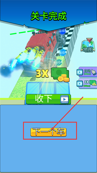 4、關卡完成后,可選擇【收下】獎勵或觀看視頻獲取【3X】收益,再點擊【下一個車】進入新的車輛養成流程。