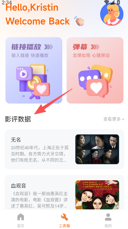 1、設工具箱板塊,整合鏈接播放、彈幕功能,同時配備影評數據板塊,覆蓋工具使用與影視信息查看兩類核心需求。