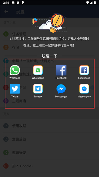 并行空間中的第二個(gè)帳戶幾乎支持所有應(yīng)用程序。兩個(gè)帳戶的數(shù)據(jù)不會(huì)相互干擾。
