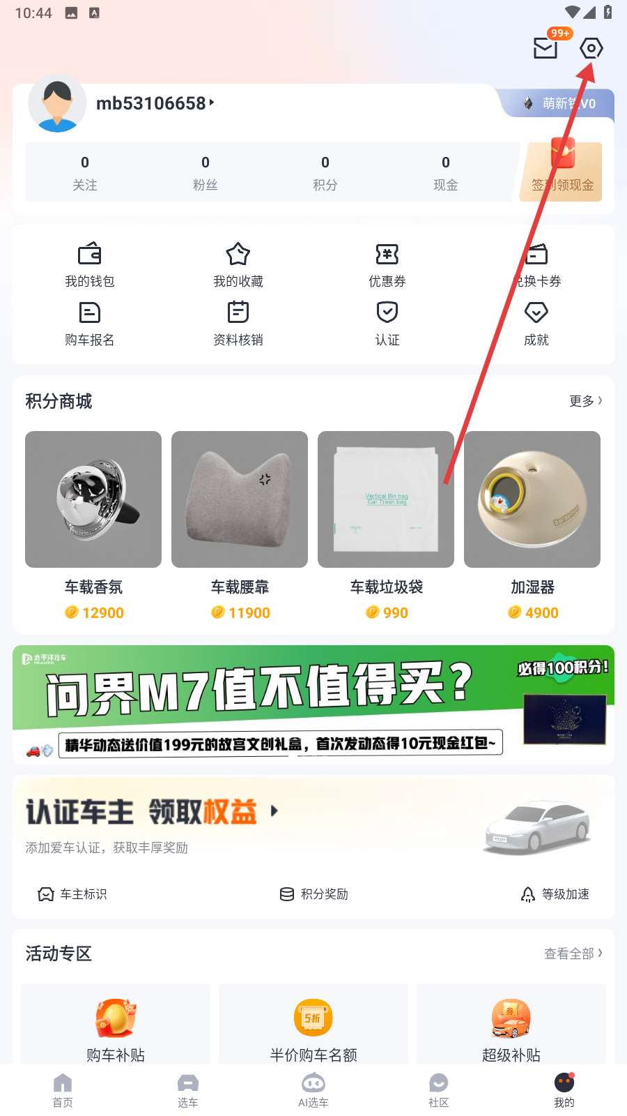 1、我們打開太平洋汽車網APP,進入【我的】頁面后,點擊右上角的設置圖標,就能進入設置界面啦。