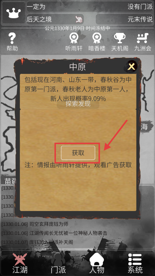 1、點(diǎn)擊【獲取】按鈕,觀看廣告可獲取【中原】區(qū)域情報(bào),了解門(mén)派分布與新人出現(xiàn)概率。