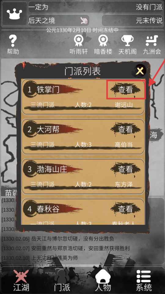 2、在【門(mén)派列表】中點(diǎn)擊【鐵掌門(mén)】的【查看】,可了解該門(mén)派的詳細(xì)信息,為后續(xù)行動(dòng)做準(zhǔn)備。