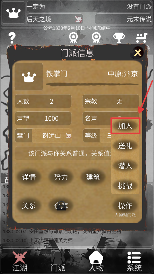 3、在【鐵掌門(mén)】的門(mén)派信息界面點(diǎn)擊【加入】,即可成為該門(mén)派弟子,參與門(mén)派事務(wù)提升實(shí)力。