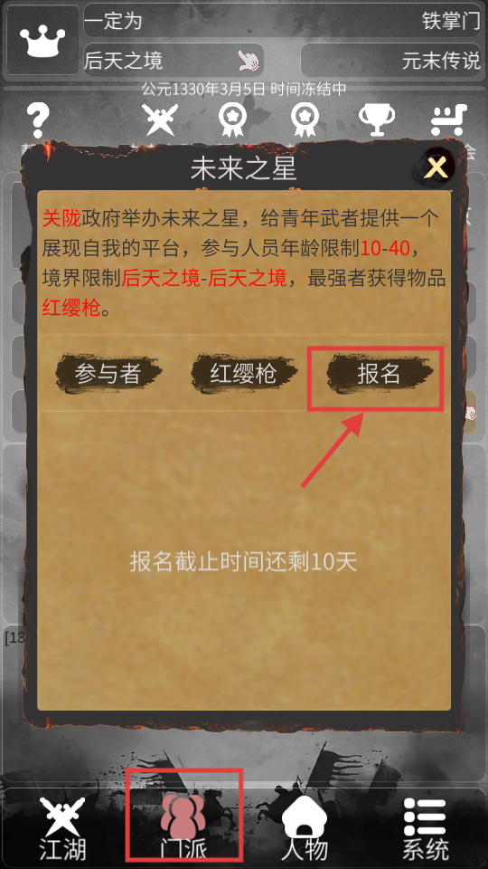 4、通過(guò)底部【門(mén)派】按鈕進(jìn)入活動(dòng)界面,滿足條件后點(diǎn)擊【報(bào)名】,參與【未來(lái)之星】活動(dòng)爭(zhēng)奪【紅纓槍】。