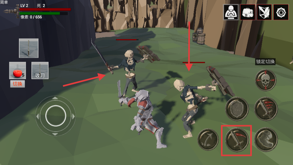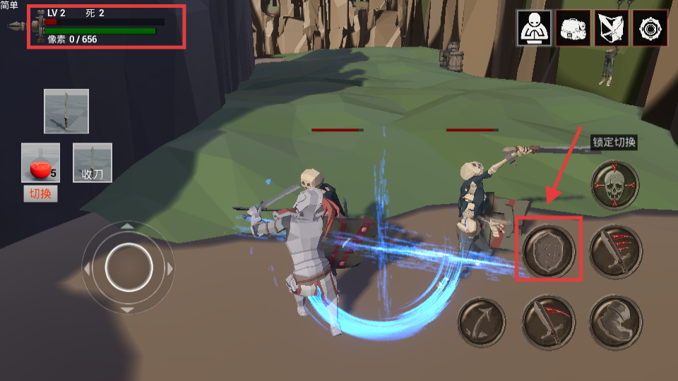 3、戰斗遇骷髏敵,用紅色框攻擊技能輸出,走位躲攻擊,積累像素進度升級。