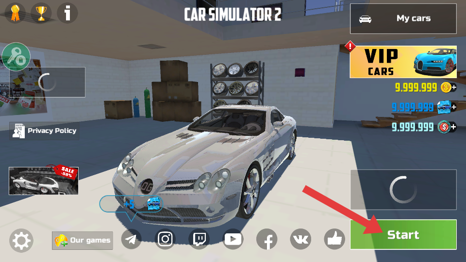 1、進入游戲界面后,點擊右下角綠色【Start】按鈕,開始游戲,利用無限金幣可解鎖各類車輛和功能。
