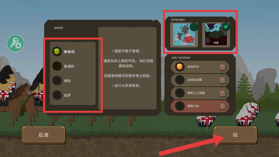 1、進入游戲后,選擇難度(如簡單的)和游戲模式(如沖突),點擊【玩】按鈕即可開始游玩。