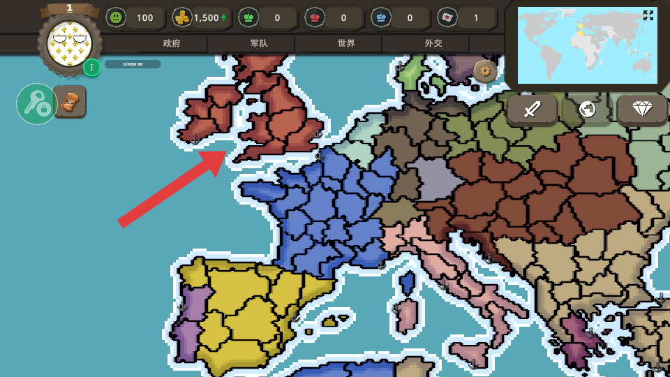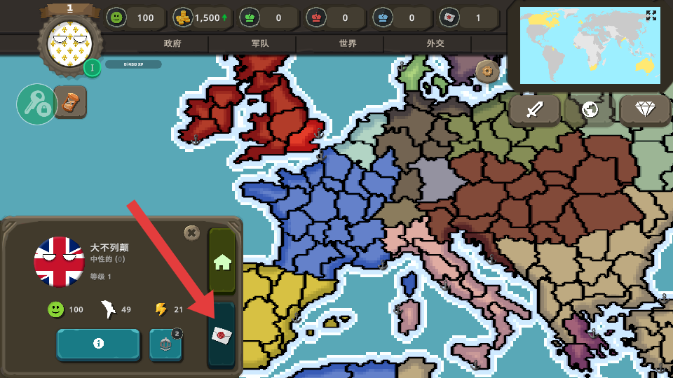 2、在世界地圖上選擇目標國家(如大不列顛),規劃勢力擴張路線。