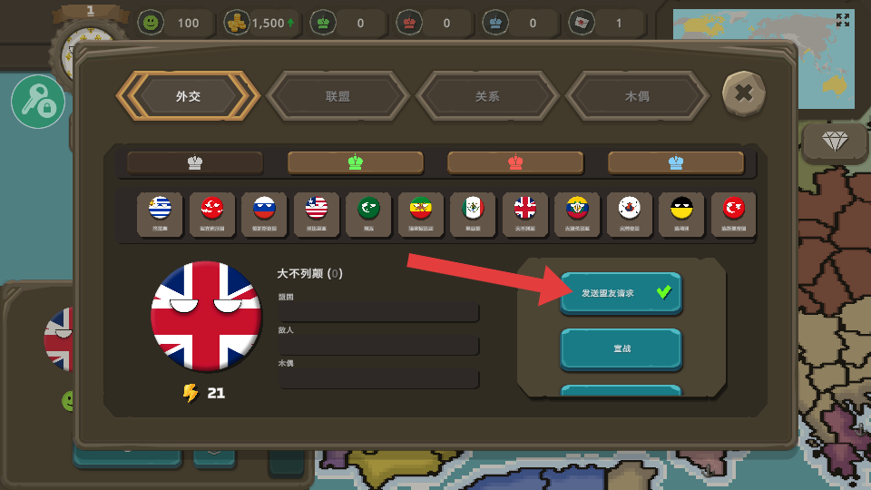 4、在外交界面,點擊【發送盟友請求】按鈕,與目標國家建立同盟,借助內置菜單優勢發展勢力。