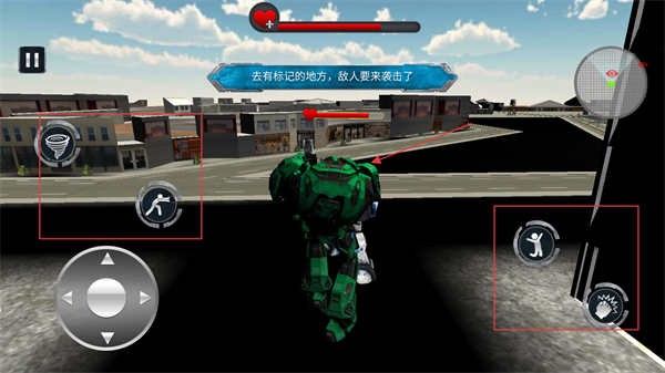 2、用左側(cè)搖桿操控機(jī)器人移動(dòng),根據(jù)提示前往有標(biāo)記的敵方襲擊區(qū)域。