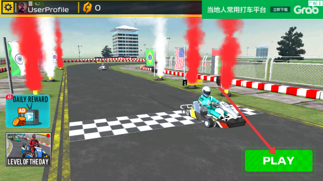1、游戲初始界面,看到綠色【PLAY】按鈕,點(diǎn)擊即可進(jìn)入卡丁車比賽,還可關(guān)注左側(cè)【DAILY-REWARD】等板塊,獲取獎(jiǎng)勵(lì)助力比賽。